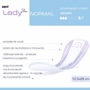 - Absorbantele urologice Seni Lady Slim Normal, au fost create special pentru femeile active, care au nevoie de confort, discreţie şi siguranţă în orice situaţie. Avand formă anatomică Seni Lady Normal, reprezintă soluţia perfectă pentru femeile care se confruntă cu probleme de incontinenţă uşoară. Acestea ofera urmatoarele beneficii: